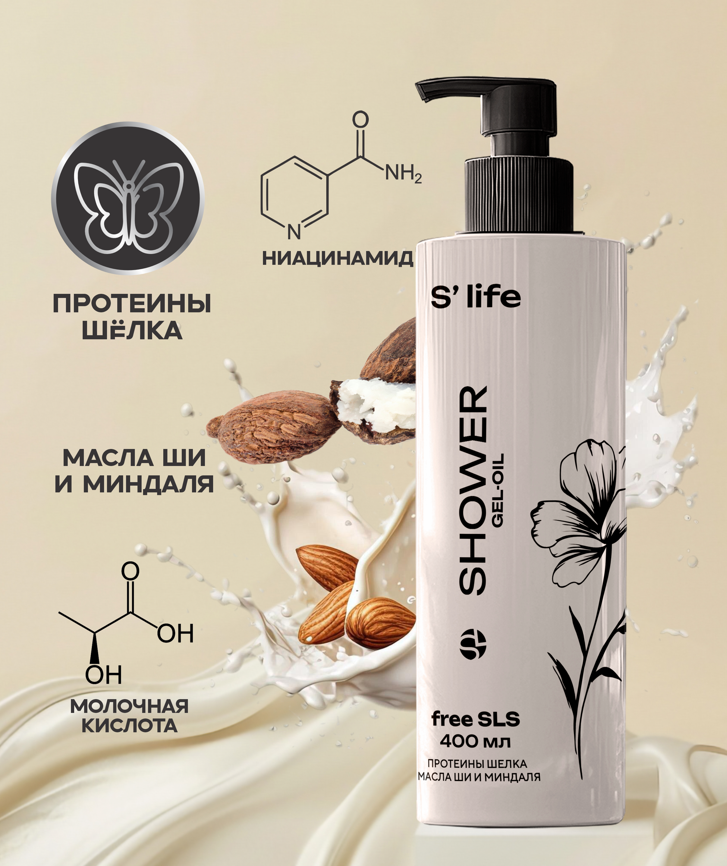 S'life қосымша нәрлендіретін душ гелі майы теріні жұмсақ тазартады, терең нәрлендіреді, ылғалмен және қоректік заттармен қанықтырады. Ылғал денеге немесе губкаға қолданғанда, ол сумен жанасқанда жібек көбікке айналады. Стресс пен шаршауды басады, теріге жағымды хош иіс қалдырады. Тұрақты қолдану нәтижесінде тері жұмсақ, барқыт және ылғалданған болады.