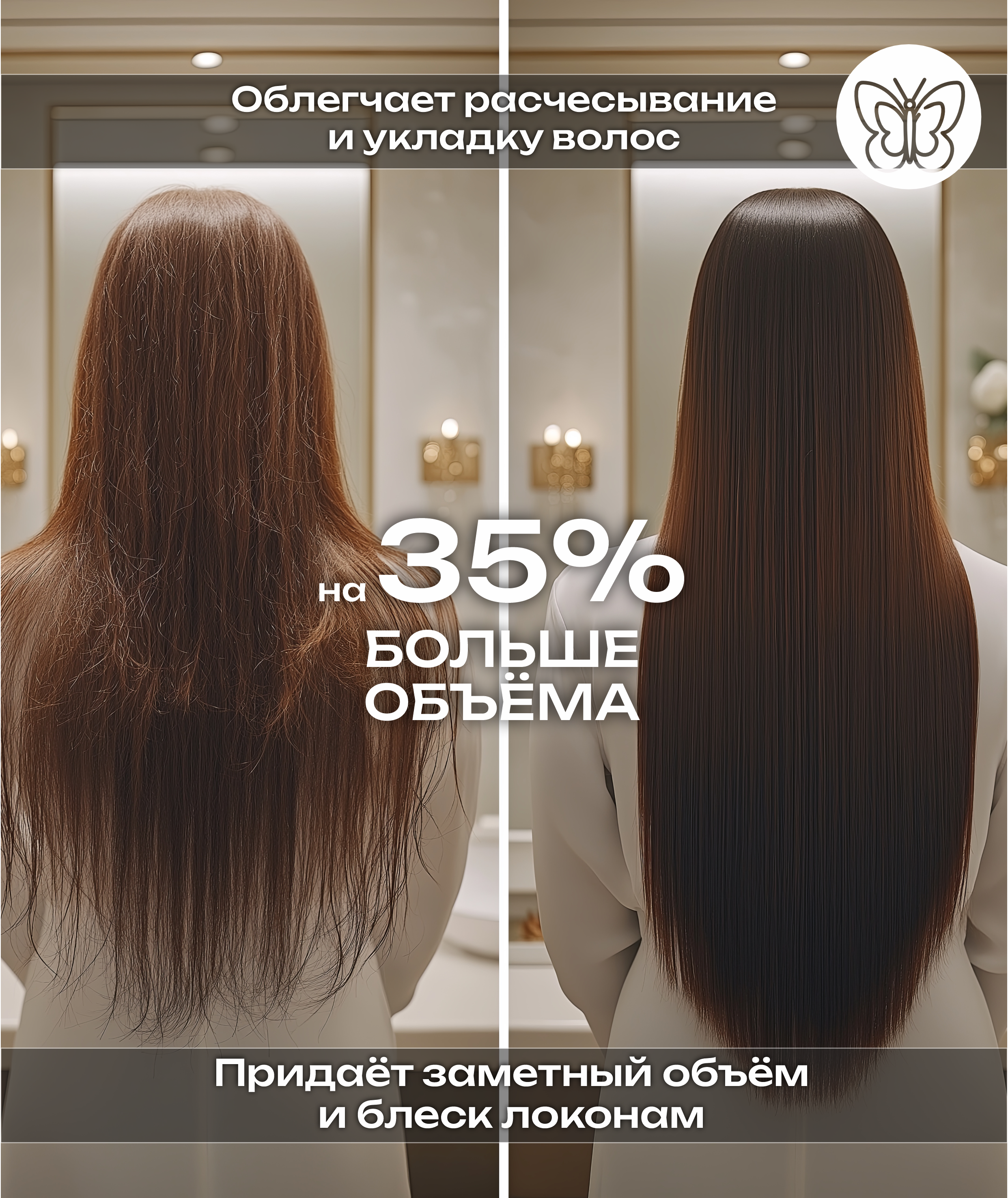 Восстанавливает тело волоса, усиливает структуру тонких, мягких волос и обеспечивает на 35% больше объёма, создавая более плотную текстуру. Придает силу ломким и поврежденным волосам. Обеспечивает видимый объем по всей поверхности волос.