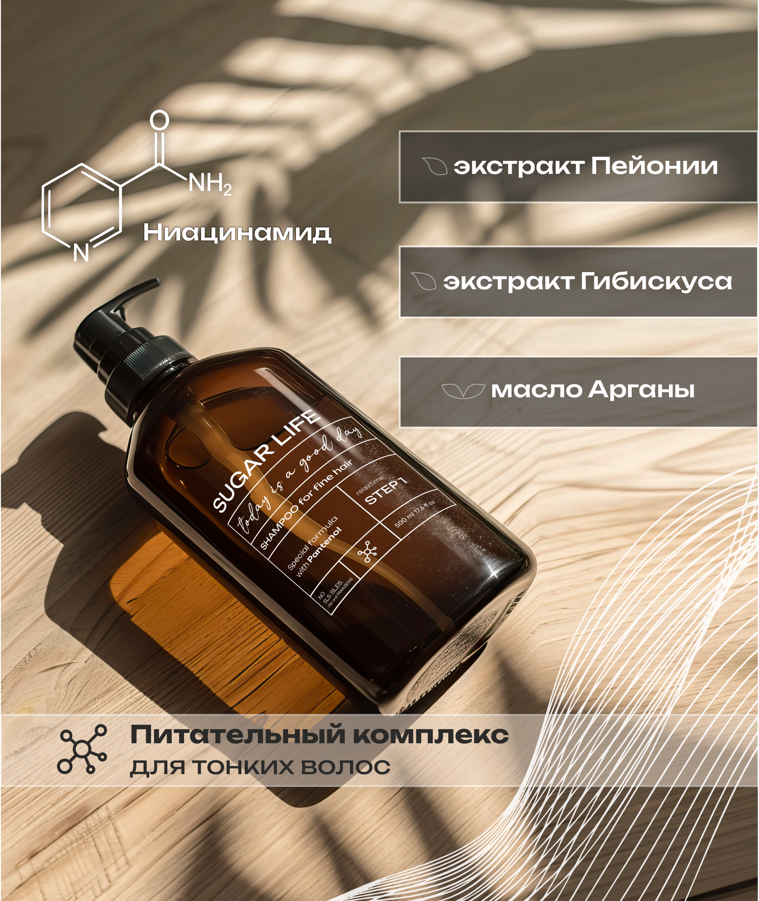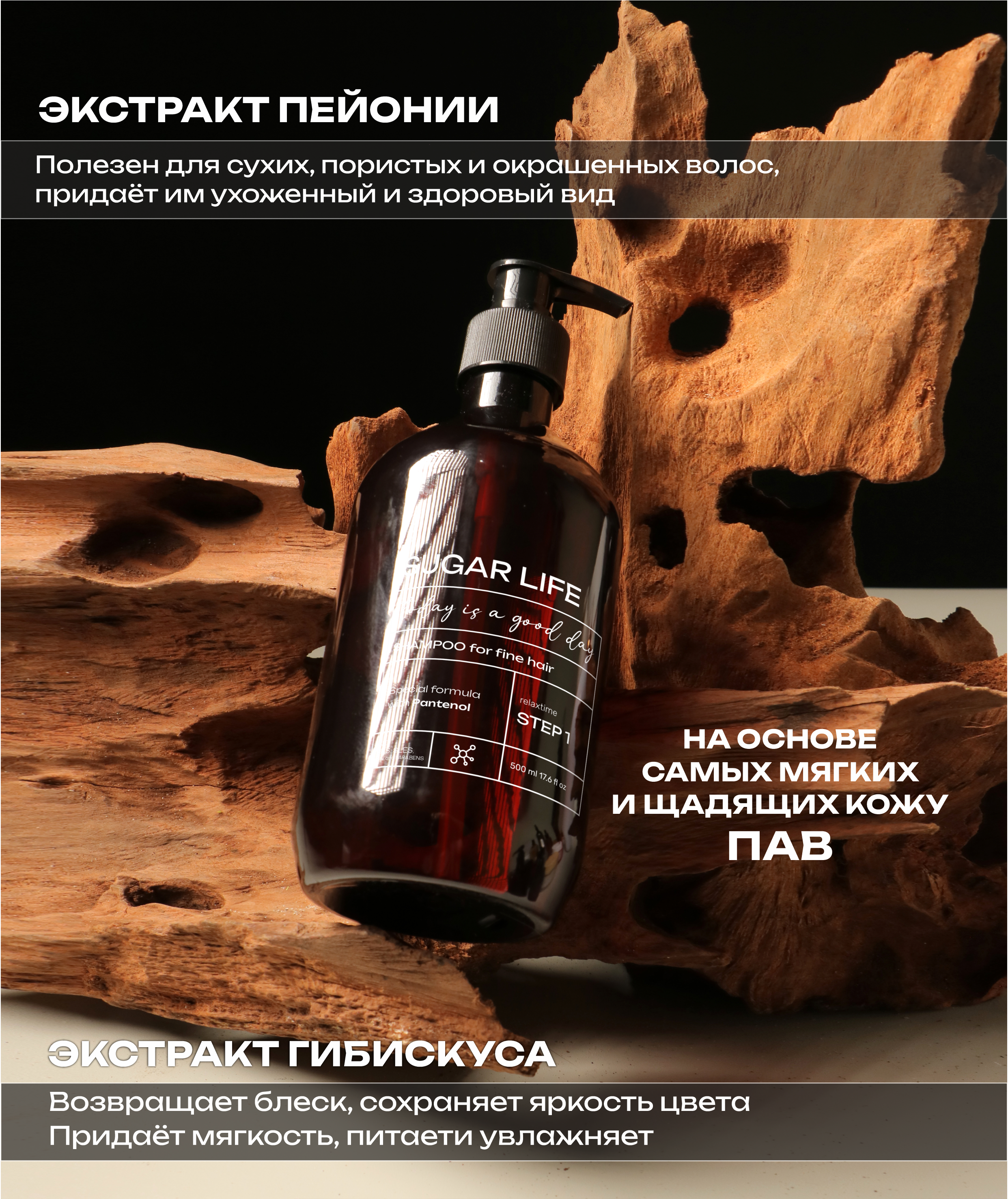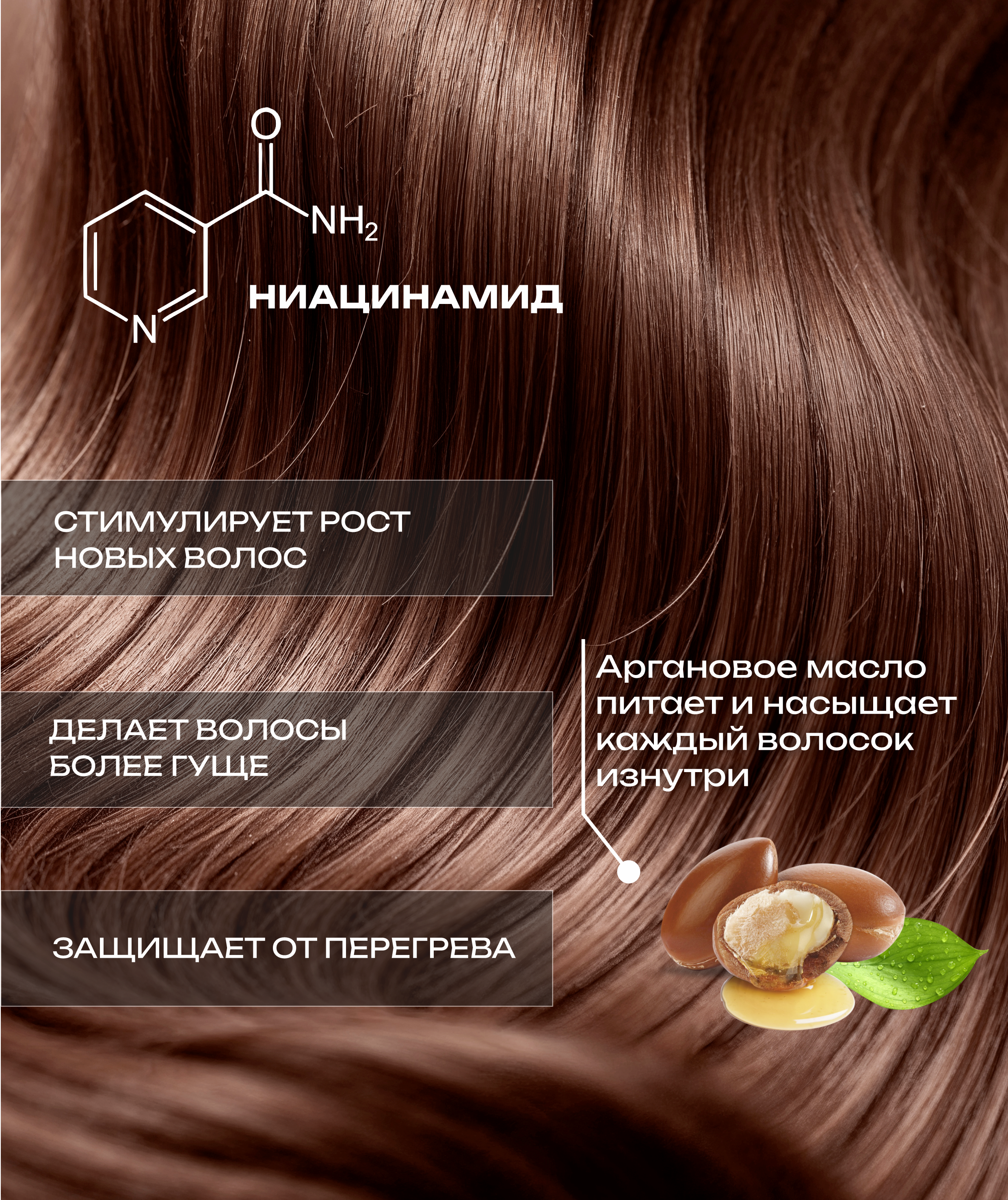 Входящий в состав Пантенол, увеличивает потенциал волос, препятствует выпадению, оказывая благотворное воздействие на волосяные луковицы. Натуральное масло Арганы позволяетсделать волосы более гладкими, дополнительно увлажняет их, без эффекта утяжеления локонов. Поддерживает объем у корней, а по длине делает пряди более гладкими, блестящими и ухоженными. Экстракт Пиона является источником флавоноидов, которые способствуют укреплению волос, помогает решить проблемы перхоти и чрезмерной жирности. Целебный экстракт Гибискуса, который благодаря богатому содержанию витаминов, минералов и протеинов, оказывает комплексное питание и способствует восстановлению структуры волос.