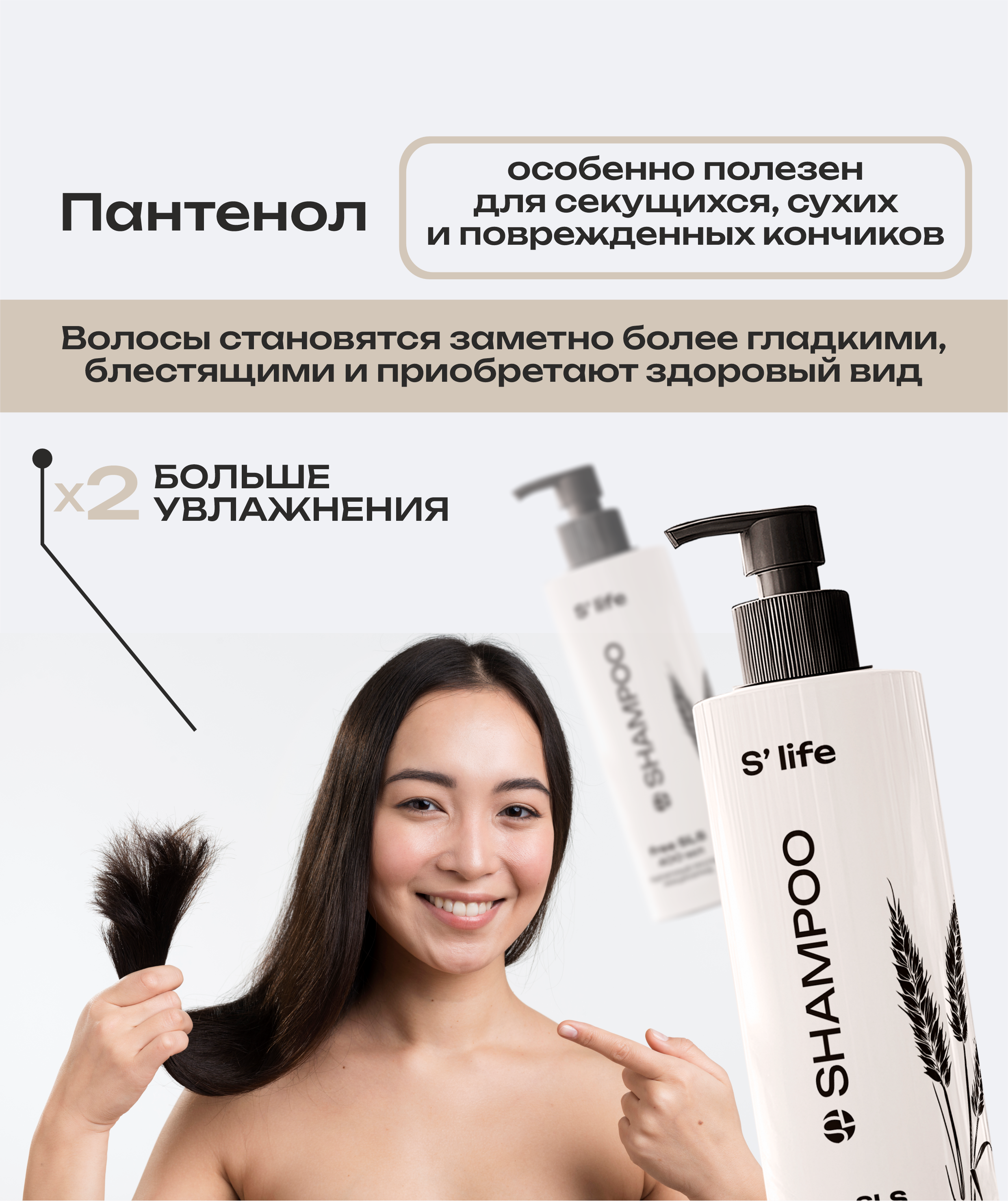 ПАНТЕНОЛ - особенно полезен для секущихся, сухих и поврежденных кончиков. Волос получается в 2 раза больше увлажнения, тем самым, становится заметно более гладким, блестящим, и приобретает здоровый вид.