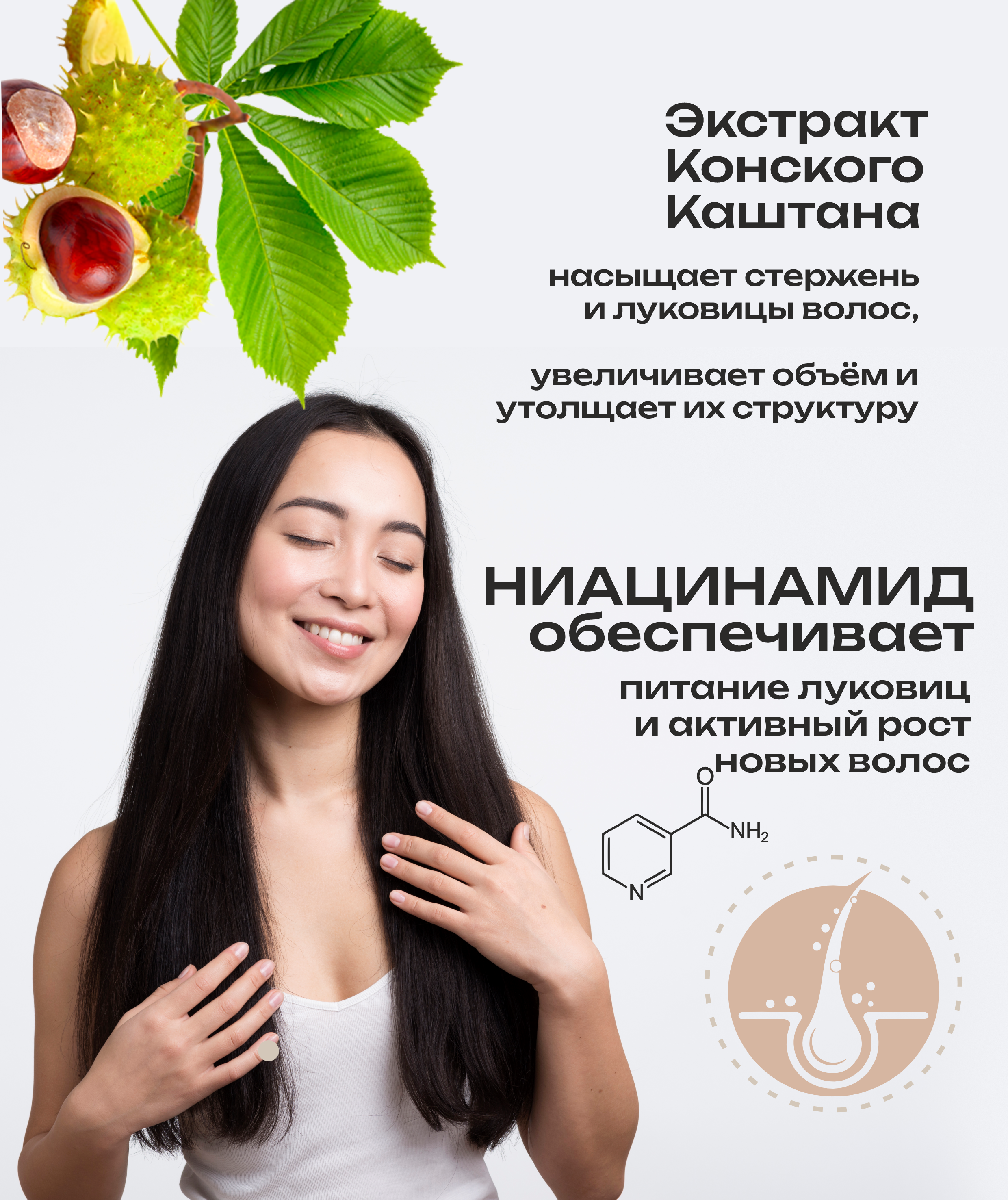 ЭКСТРАКТ КОНСКОГО КАШТАНА - идеальный ингредиент для ухода за волосами. Насыщает стержень и луковицы волос, квеличивает объём и уплотняет их структуру.